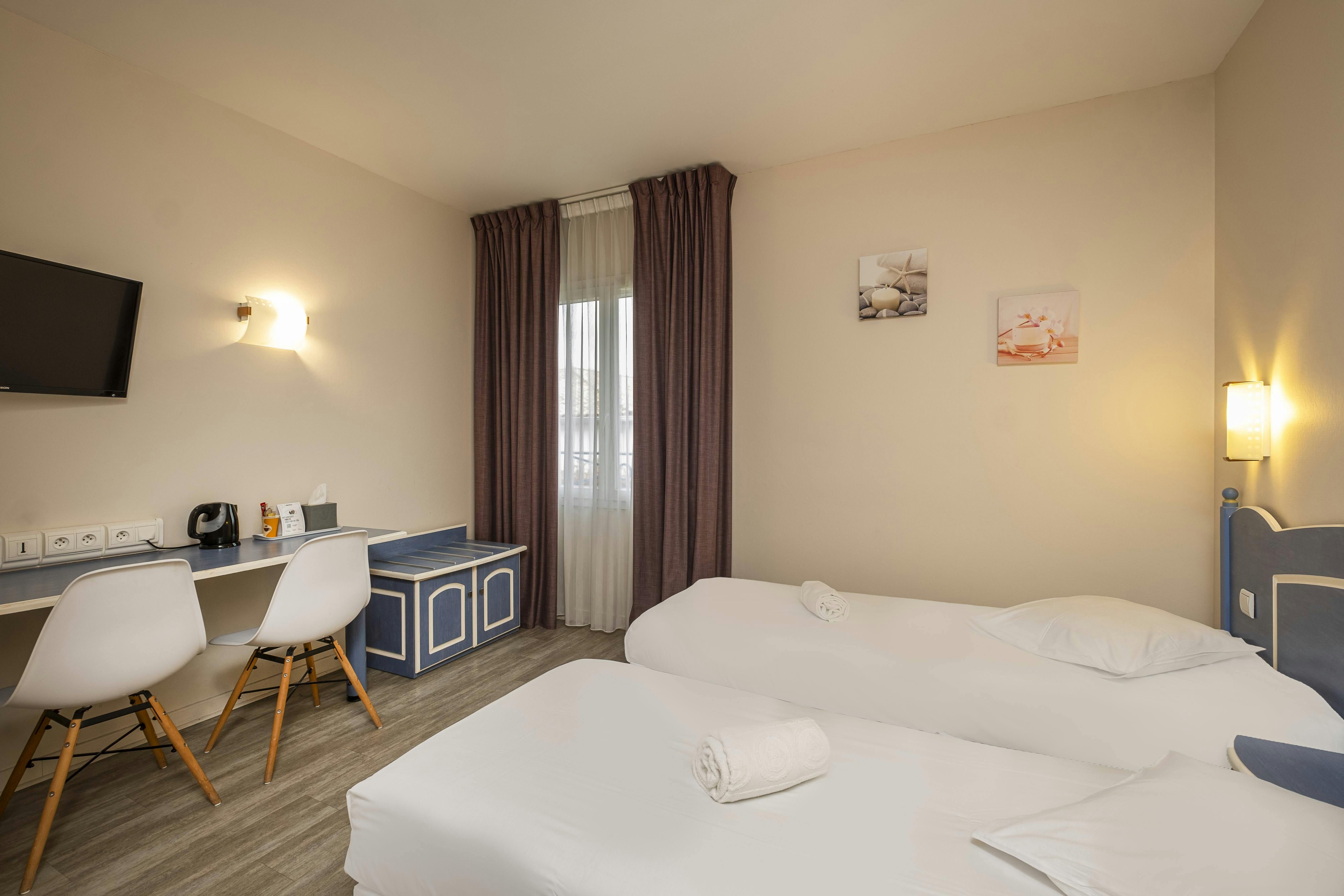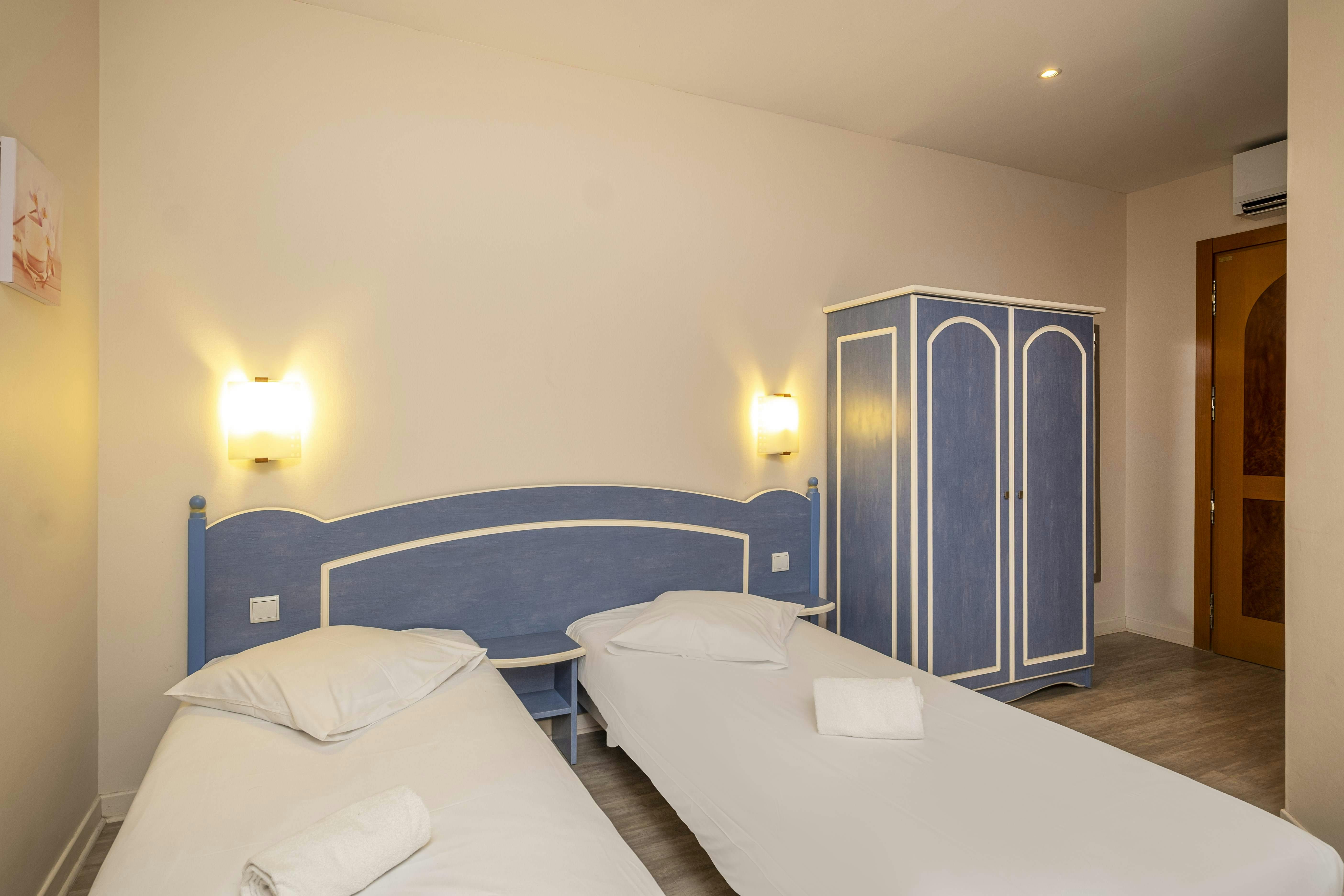 Die geräumigen (18 m²), klimatisierten und schalldichten Zimmer für 1 oder 2 Personen verfügen über zwei Einzelbetten mit 90 cm Breite. Diese Zimmer sind mit einem 82 cm Full HD-Fernseher mit Satellitenempfang, Internetzugang, einer Toilette, einem komfortablen Badezimmer sowie einem Willkommenstablett (Tee, Kräutertee, Kaffee usw.) ausgestattet.